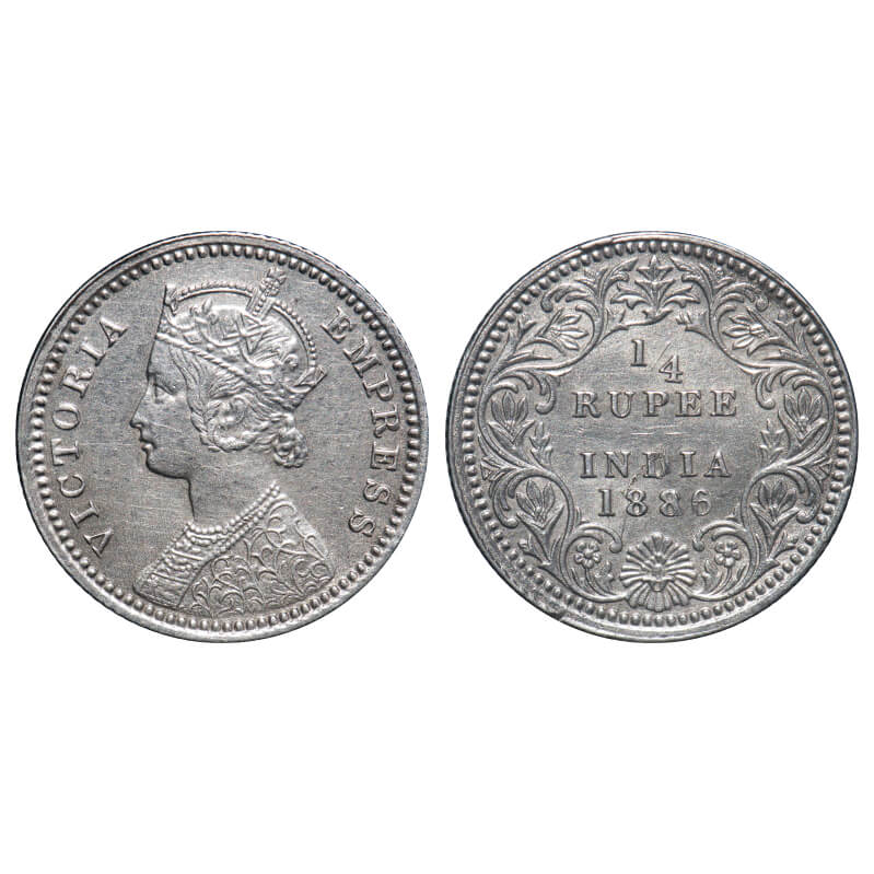 Victoria Empress, Silver, 1/4 Rupee, 1886, Calcutta Mint, C/II, 'C' incised. F. Prid 391. GK 707. Very Fine+. Very Scarce.