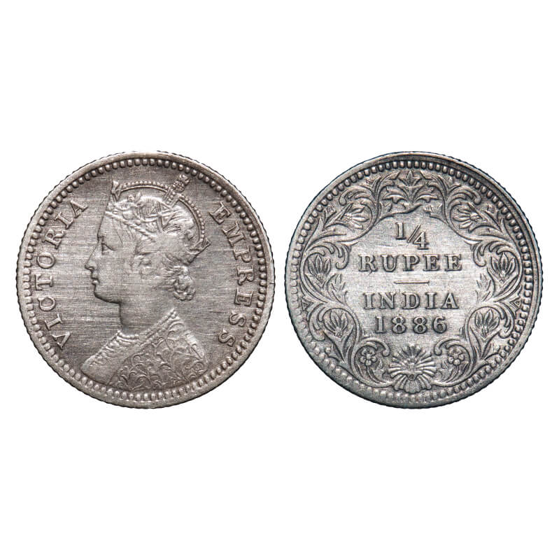 Victoria Empress, Silver, 1/4 Rupee, 1886, Calcutta Mint, C/II, 'C' incused. F. Prid 391. GK 707. Very Fine+. Very Scarce.
