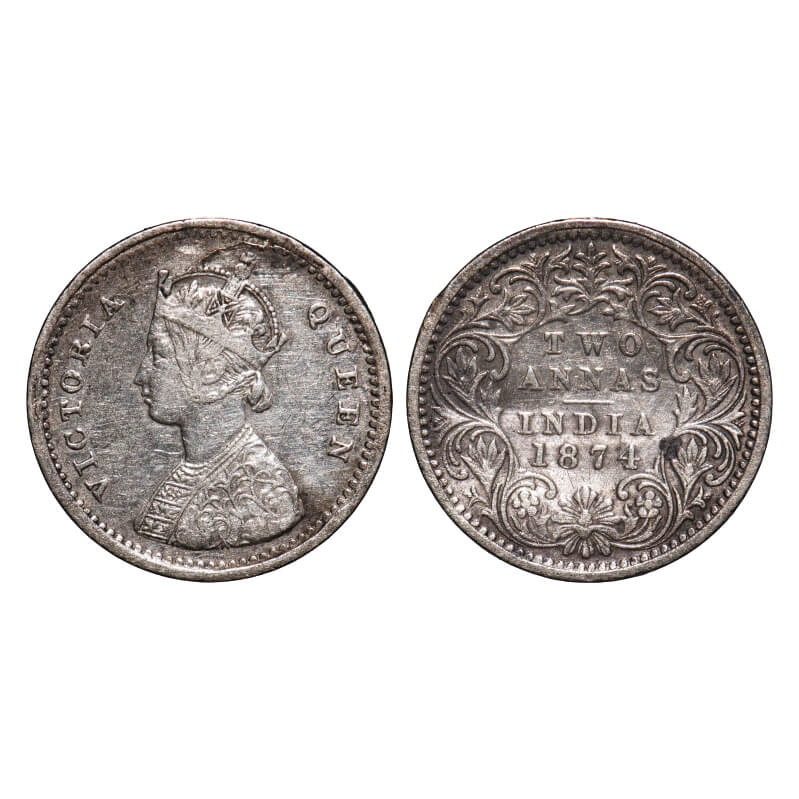 Victoria Queen, Silver, 2 Annas, 1874, Bombay Mint, A/I, No mint mark, No dot. F. Prid Unlisted. GK...
