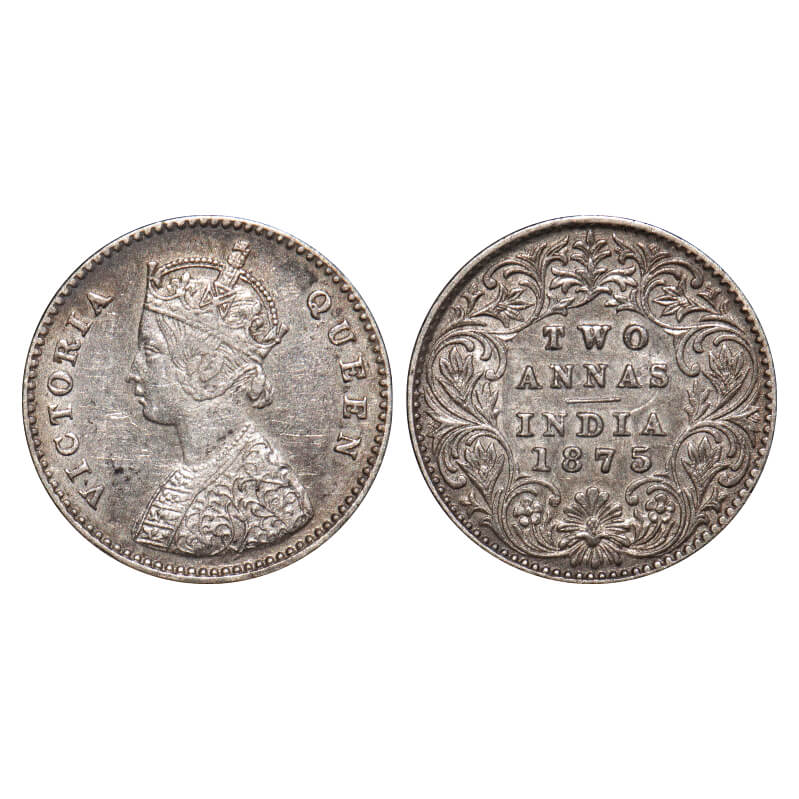 Victoria Queen, Silver, 2 Annas, 1875, Calcutta Mint, A/I, No mint mark, Ghost on Rev. F. Prid 489. GK 742. About Uncirculated. Rare.