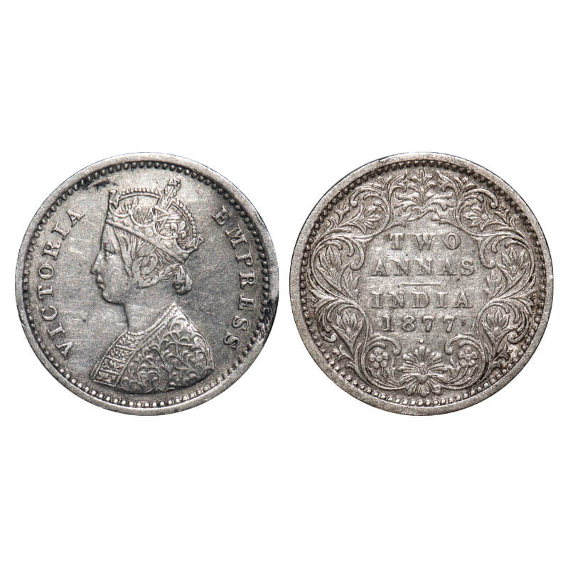 Victoria Empress, Silver, 2 Annas, 1877, Calcutta Mint, A/I, No mint mark. F. Prid. 491. GK 748. Ex...