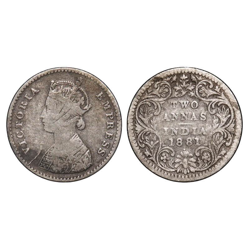 Victoria Empress, Silver, 2 Annas, 1881, Bombay Mint, A/II, Dot, Die cracks on Obv. F. Prid. 523. GK 756. Very Fine. Very Scarce.