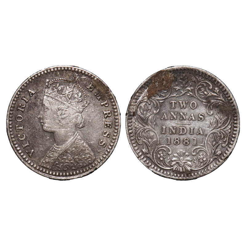 | Victoria Empress, Silver, 2 Annas, 1881, Calcutta Mint, B/II, 'C' incised, Die crack on Obv, Some bust design has a incused embroidery design. F. Prid. 496. GK 758. Very Fine+. Rare. |