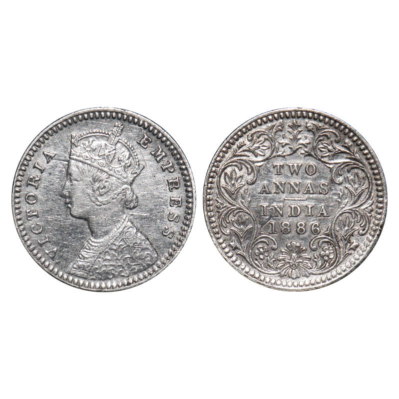 | Victoria Empress, Silver, 2 Annas, 1886, Calcutta Mint, B/II, 'C' incused, Die crack on Obv, Ghost on Rev. F. Prid 501. GK 782. Extremely Fine+. Very Scarce. |