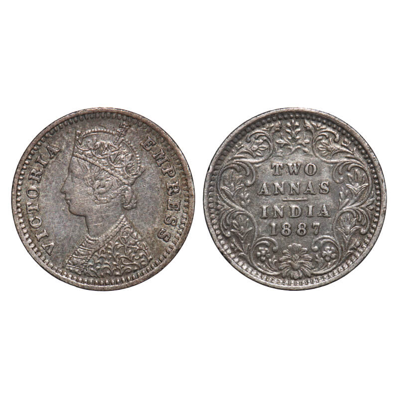 | Victoria Empress, Silver, 2 Annas, 1887, Bombay Mint, B/II, 'B' incised, Die crack on Obv. F. Prid. 540. GK 783. Almost Uncirculated, Toned. Rare. |