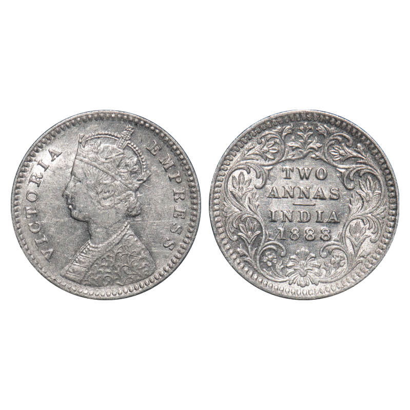 Victoria Empress, Silver, 2 Annas, 1888, Bombay Mint, B/II, 'B' incused, Ghost on Rev. F. Prid 541. GK 785. Almost Uncirculated. Very Scarce.