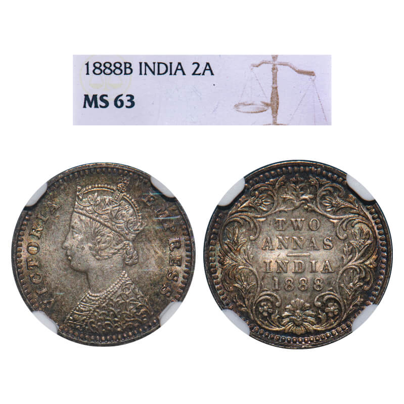 Victoria Empress, Silver, 2 Annas, 1888, Bombay Mint, B/II, 'B' incused. F. Prid 541. GK 785. NGC Slabbed MS 63. Extremely Rare.
