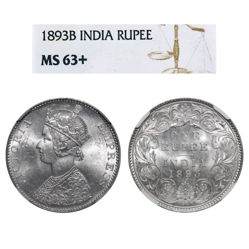 Victoria Empress, Silver, Rupee, 1893, Bombay Mint, C2/I(ii), 'B' incused, Normal numeral 3. F. Prid 182. GK 578. NGC Slabbed MS 63+. Extremely Rare.