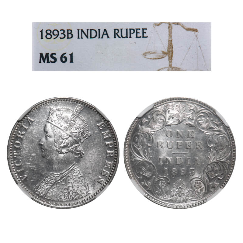 Victoria Empress, Silver, Rupee, 1893, Bombay Mint, C2/I(ii), 'B' incused, Large numeral 3. F. Prid 182. GK 579. NGC Slabbed MS 61. Rare.