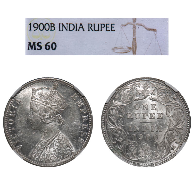Victoria Empress, Silver, Rupee, 1900, Bombay Mint, A3(i)/I(ii), 'B' incused. F. Prid 186. GK 589. NGC Slabbed MS 60. Rare.