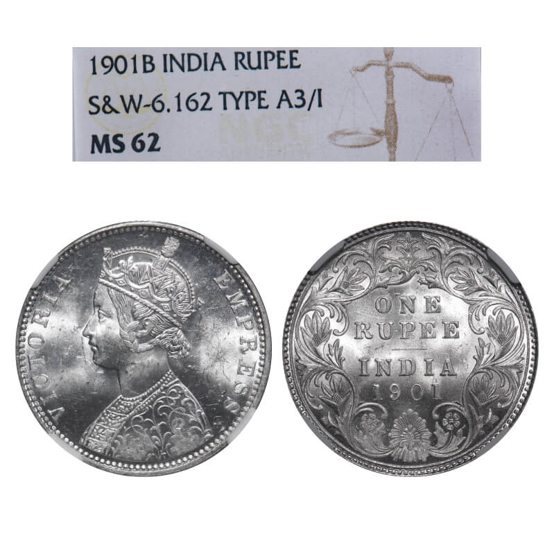 Victoria Empress, Silver, Rupee, 1901, Bombay Mint, A3(i)/I(ii), 'B' incused. F. Prid Unlisted. GK 591. NGC Slabbed MS 62. Very Rare.