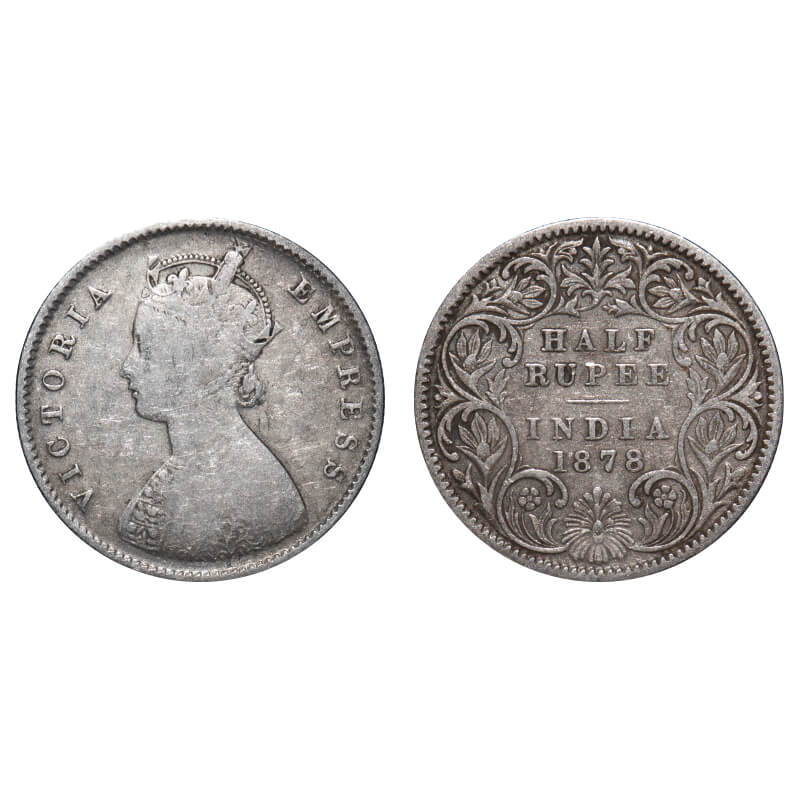 Victoria Empress, Silver, Half Rupee, 1878, Calcutta Mint, A/I, No mint mark. F. Prid 262. GK 612. Fine+. Very Scarce.