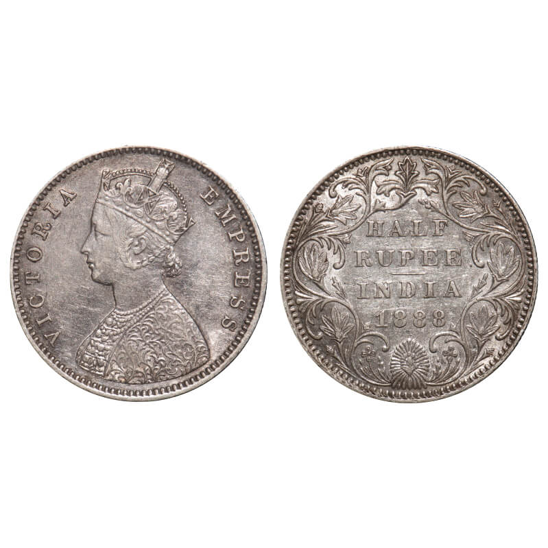 Victoria Empress, Silver, Half Rupee, 1888, Bombay Mint, A/II(i), No mint mark, w/o 'B' mark. F. Prid 297. GK 638. About Uncirculated. Rare.