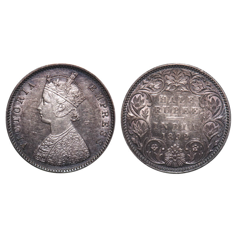 | Victoria Empress, Silver, Half Rupee, 1892, Bombay Mint, A/I, 'B' incused, Nicks on Rev rim edge. F. Prid 302. GK 646. About Uncirculated, Toned. Rare. |