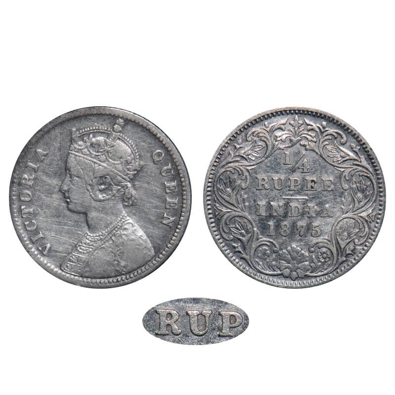 | Victoria Queen, Silver, 1/4 Rupee, 1875, Calcutta Mint, A/I, No mint mark, No 'C', Tilted 'U' in Rupee. F. Prid Unlisted. GK Unlisted. Very Fine. Very Rare. |