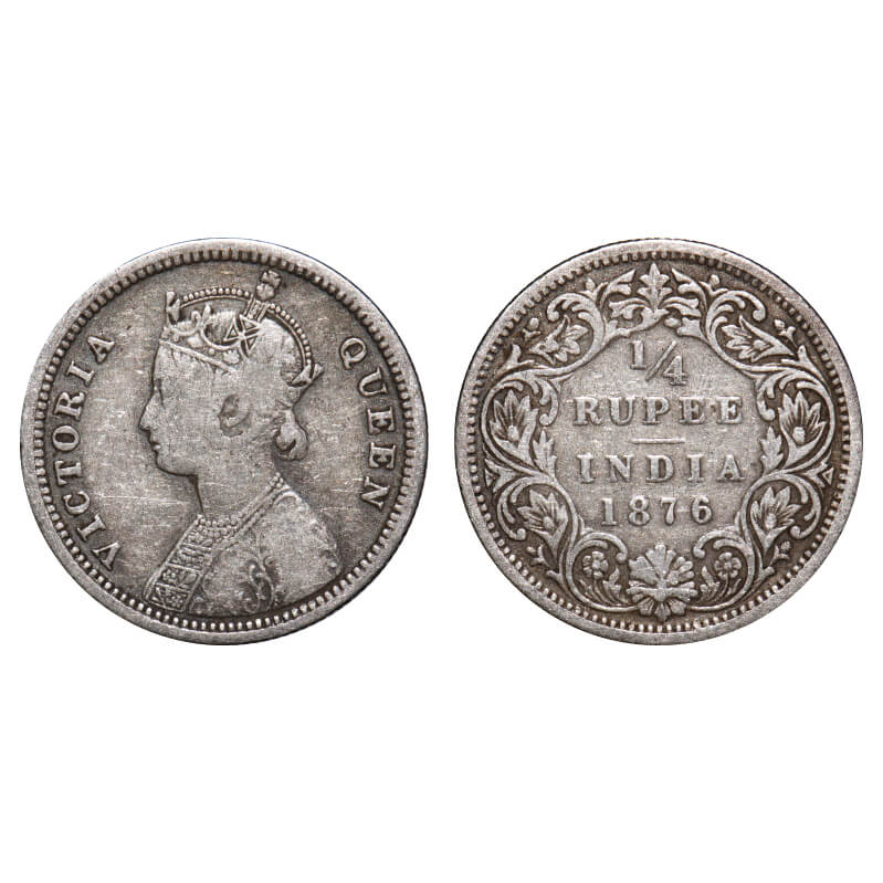 Victoria Queen, Silver, 1/4 Rupee, 1876, Bombay Mint, A/I, No dot. F. Prid 407. GK 668. Fine+. Very Scarce.