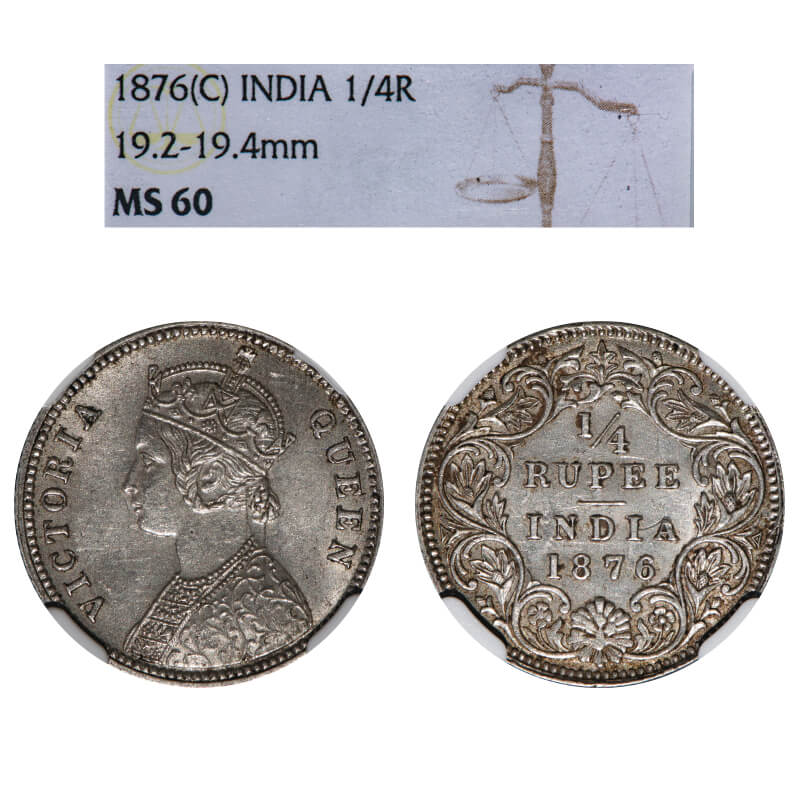 | Victoria Queen, Silver, 1/4 Rupee, 1876, Calcutta Mint, A/I, No mint mark, No 'C', The coin is wrongly placed in the slab instead of aligned it is kept inverted. F. Prid 381. GK 669. NGC Slabbed MS 60. Very Rare. |