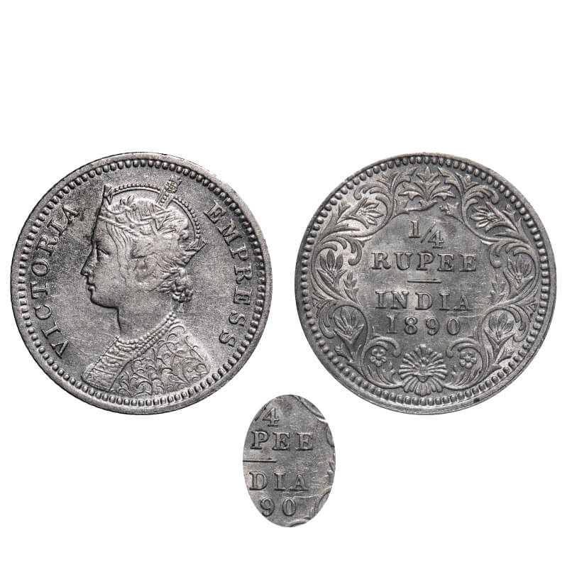 Victoria Empress, Silver, 1/4 Rupee, 1890, Calcutta Mint, C/II, 'C' incused, Double ghost impression of Victoria on Rev. F. Prid 395. GK 719. Extremely Fine+. Very Scarce.