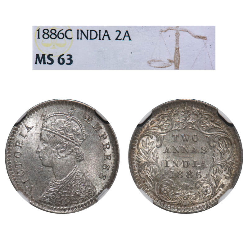 Victoria Empress, Silver, 2 Annas, 1886, Calcutta Mint, D/II, 'C' incused. F. Prid 501. GK 782. NGC Slabbed MS 63. Extremely Rare.