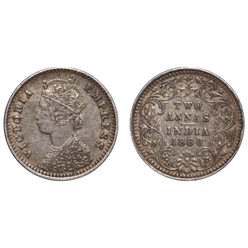 Victoria Empress, Silver, 2 Annas, 1888, Bombay Mint, B/II, 'B' incused, Die cracks on Obv. F. Prid 541. GK 785. Extremely Fine+. Very Scarce.