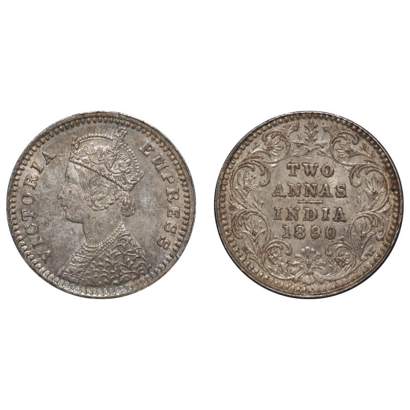 Victoria Empress, Silver, 2 Annas, 1890, Bombay Mint, B/II, No mint mark, No B. F. Prid 543. GK 789. Uncirculated. Rare.