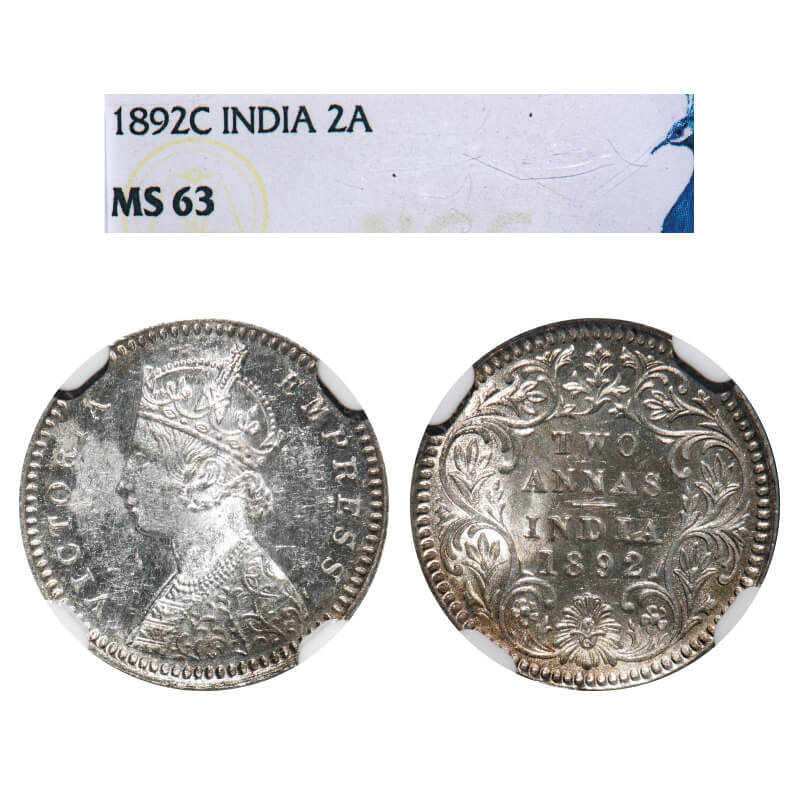 Victoria Empress, Silver, 2 Annas, 1892, Calcutta Mint, B/II, 'C' incused. F. Prid 507. GK 797. NGC Slabbed MS 63. Extremely Rare.