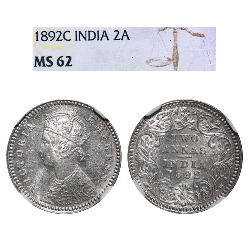 Victoria Empress, Silver, 2 Annas, 1892, Calcutta Mint, B/II, 'C' incused. F. Prid 507. GK 797. NGC Slabbed MS 62. Extremely Rare.