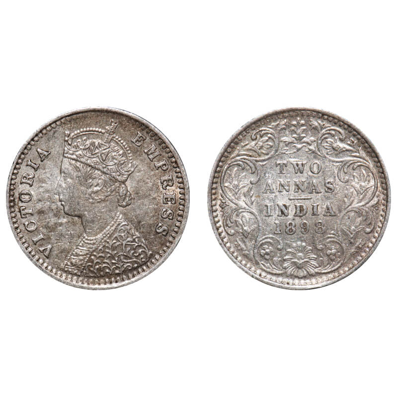 Victoria Empress, Silver, 2 Annas, 1898, Bombay Mint, B/II, 'B' incused, Die crack on Obv. F. Prid 552. GK 809. About Uncirculated. Very Scarce.