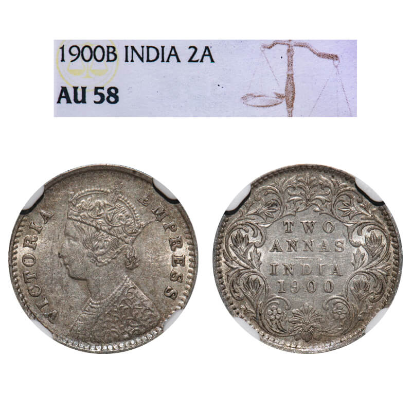 Victoria Empress, Silver, 2 Annas, 1900, Bombay Mint, B/I, 'B' raised, Big B. F. Prid 553. GK 812. NGC Slabbed AU 58. Very Rare.