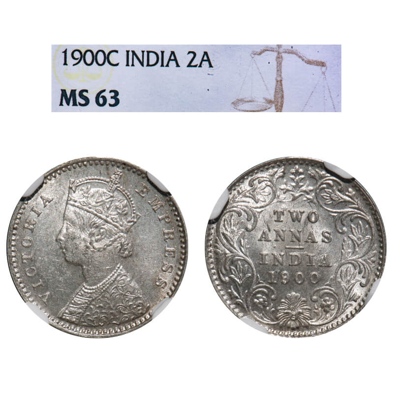 Victoria Empress, Silver, 2 Annas, 1900, Calcutta Mint, B/II, 'C' incused. F. Prid 514. GK 814. NGC Slabbed MS 63. Extremely Rare.