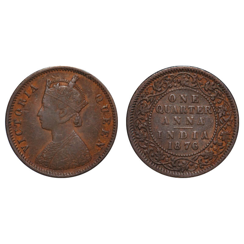 Victoria Queen, Copper, Quarter Anna, 1876, Calcutta Mint, B/II, No mint mark. F. Prid 610. GK 827. Very Fine. Very Scarce.