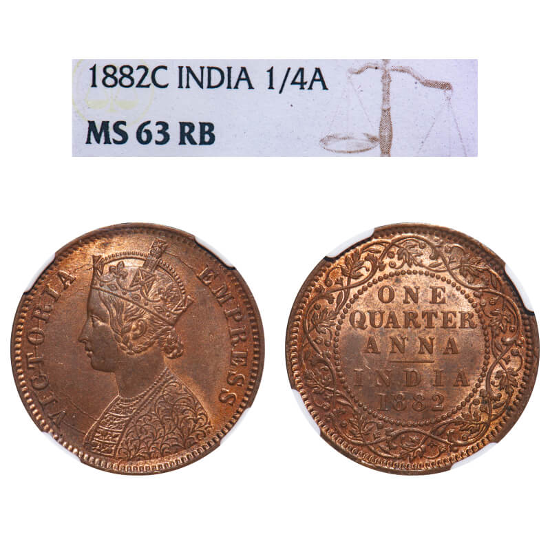 Victoria Empress, Copper, Quarter Anna, 1882, Calcutta Mint, B/II, 'C' incused. F. Prid 615. GK 835. NGC Slabbed MS 63 RB. Very Rare.