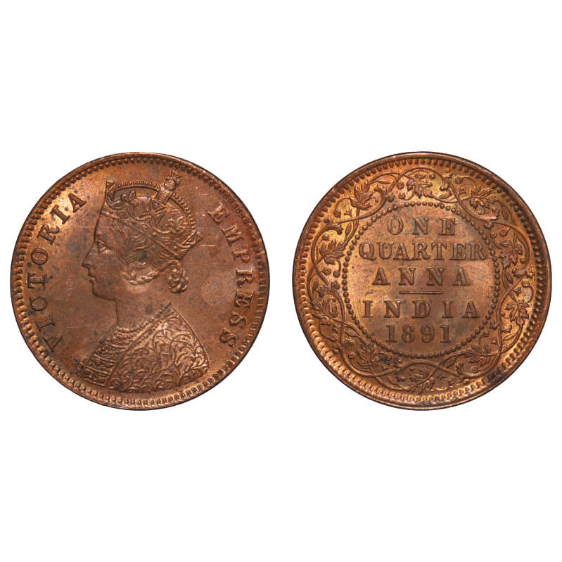 Victoria Empress, Copper, Quarter Anna, 1891, Calcutta Mint, B/II, No mint mark. F. Prid 624. GK 850. Uncirculated, Details. Very Scarce.