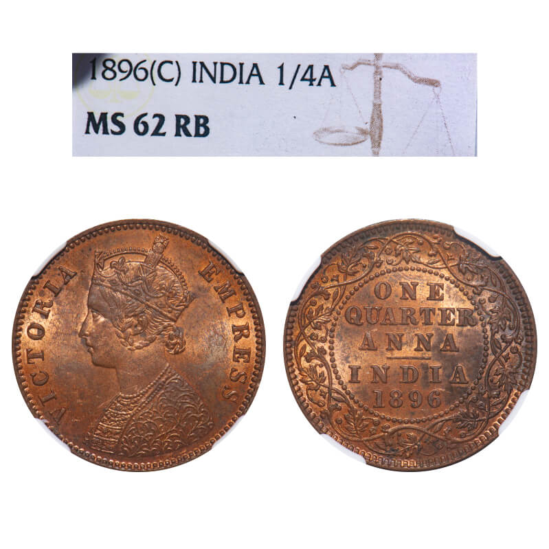 Victoria Empress, Copper, Quarter Anna, 1896, Calcutta Mint, B/II, No mint mark. F. Prid 629. GK 855. NGC Slabbed MS 62 RB. Very Rare.