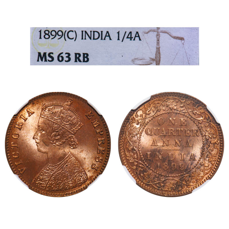 Victoria Empress, Copper, Quarter Anna, 1899, Calcutta Mint, B/II, No mint mark. F. Prid 632. GK 858. NGC Slabbed MS 63 RB. Extremely Rare.