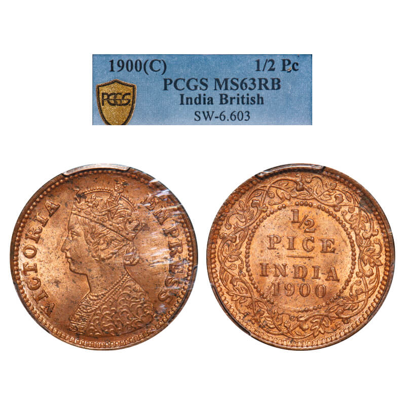 Victoria Empress, Copper, 1/2 Pice, 1900, Calcutta Mint, A/I, No mint mark. F. Prid 733. GK 880. PCGS Slabbed MS 63 RB. Extremely Rare.