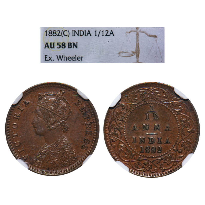 Victoria Empress, Copper, 1/12 Anna, 1882, Calcutta Mint, 'C' incused, Obv B. F. Prid 788. GK 893. NGC Slabbed AU 58 BN. Rare.