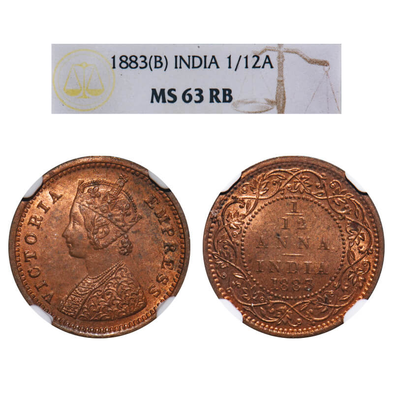 Victoria Empress, Copper, 1/12 Anna, 1883, Bombay Mint, No mint mark, Obv A. F. Prid 811. GK 895. NGC Slabbed MS 63 RB. Very Rare.