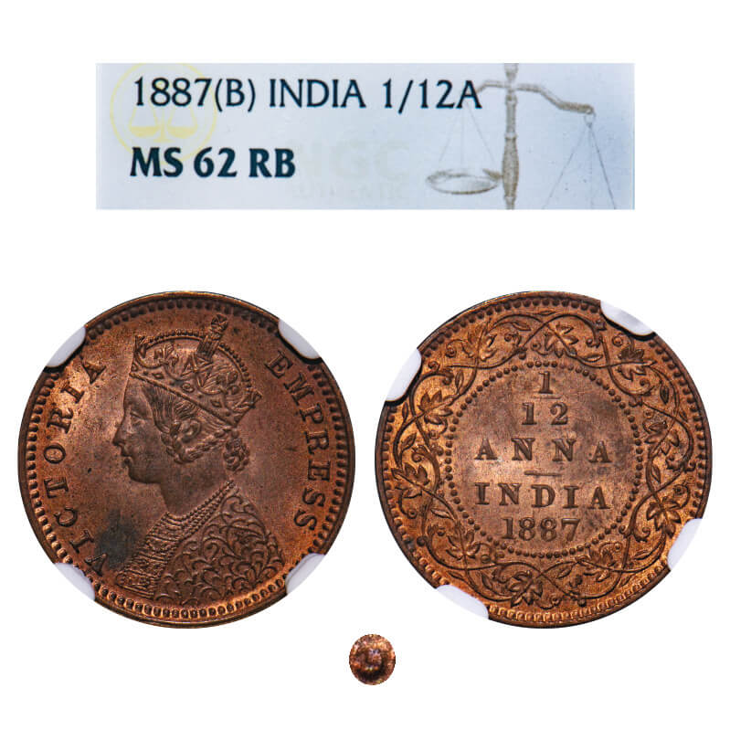 Victoria Empress, Copper, 1/12 Anna, 1887, Calcutta Mint, 'C' incused, Obv B, The slab mentions Bombay Mint but the coin is of Calcutta Mint. F. Prid 792. GK 905. NGC Slabbed MS 62 RB. Rare.