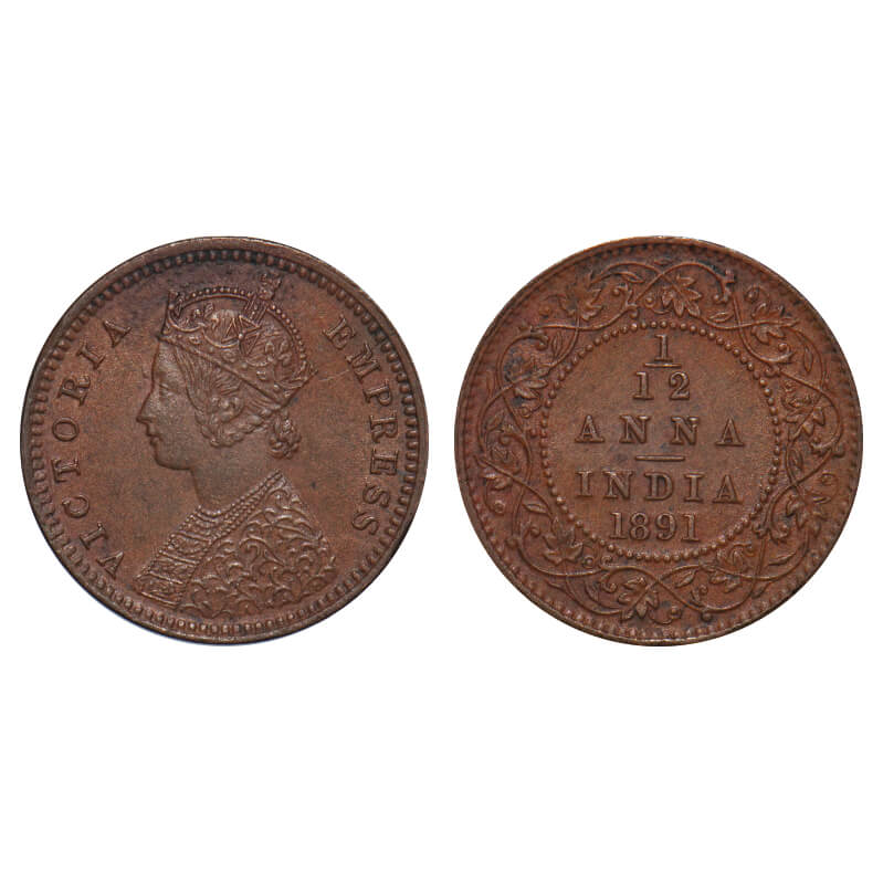 Victoria Empress, Copper, 1/12 Anna, 1891, Calcutta Mint, No mint mark, Obv B. F. Prid 796. GK 912....