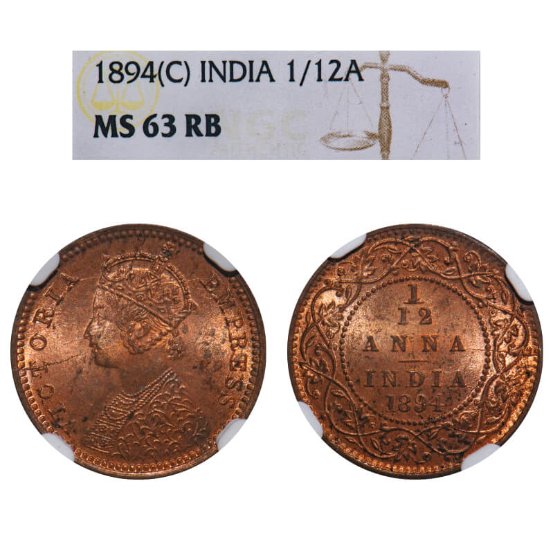 Victoria Empress, Copper, 1/12 Anna, 1894, Calcutta Mint, No mint mark, Obv B. F. Prid 799. GK 915. NGC Slabbed MS 63 RB. Very Rare.