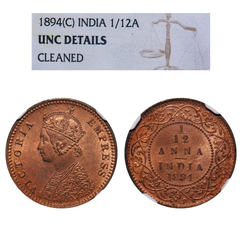 Victoria Empress, Copper, 1/12 Anna, 1894, Calcutta Mint, No mint mark, Obv B. F. Prid 799. GK 915. NGC Slabbed UNC Details, Cleaned. Very Scarce.