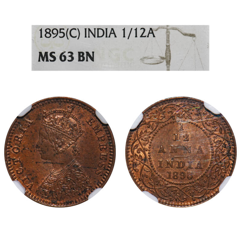 Victoria Empress, Copper, 1/12 Anna, 1895, Calcutta Mint, No mint mark, Obv B. F. Prid 800. GK 916. NGC Slabbed MS 63 BN. Very Rare.