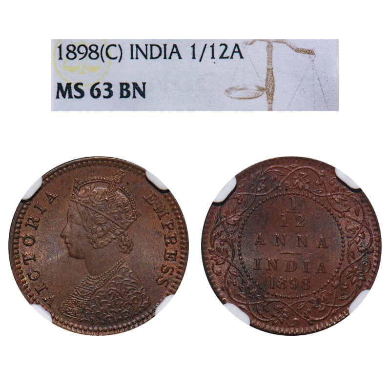 Victoria Empress, Copper, 1/12 Anna, 1898, Calcutta Mint, No mint mark, Obv B. F. Prid 803. GK 919. NGC Slabbed MS 63 BN. Extremely Rare.