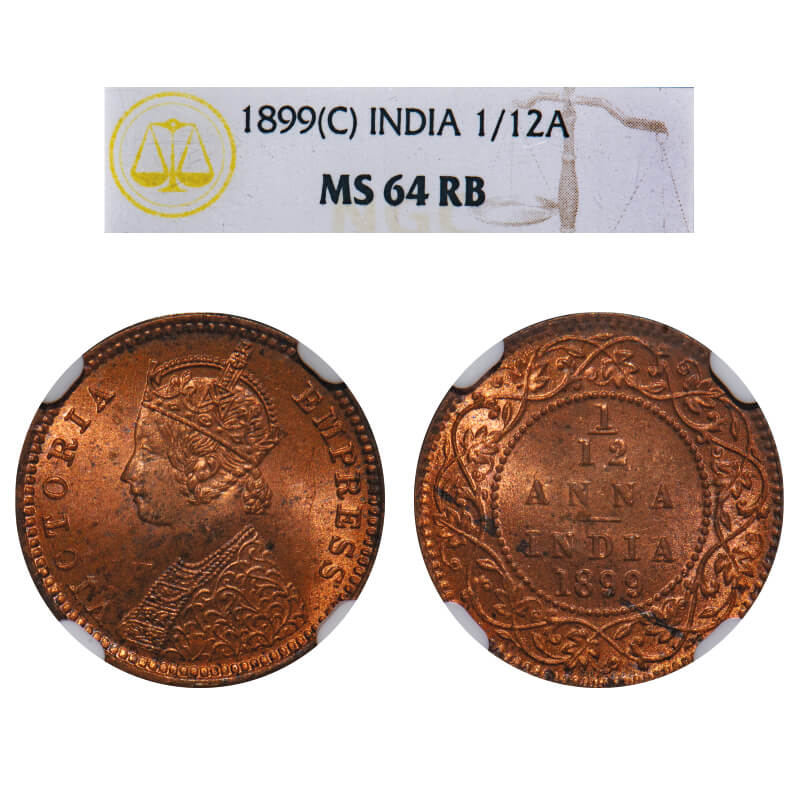 Victoria Empress, Copper, 1/12 Anna, 1899, Calcutta Mint, No mint mark, Obv B. F. Prid 804. GK 920. NGC Slabbed MS 64 RB. Very Rare.