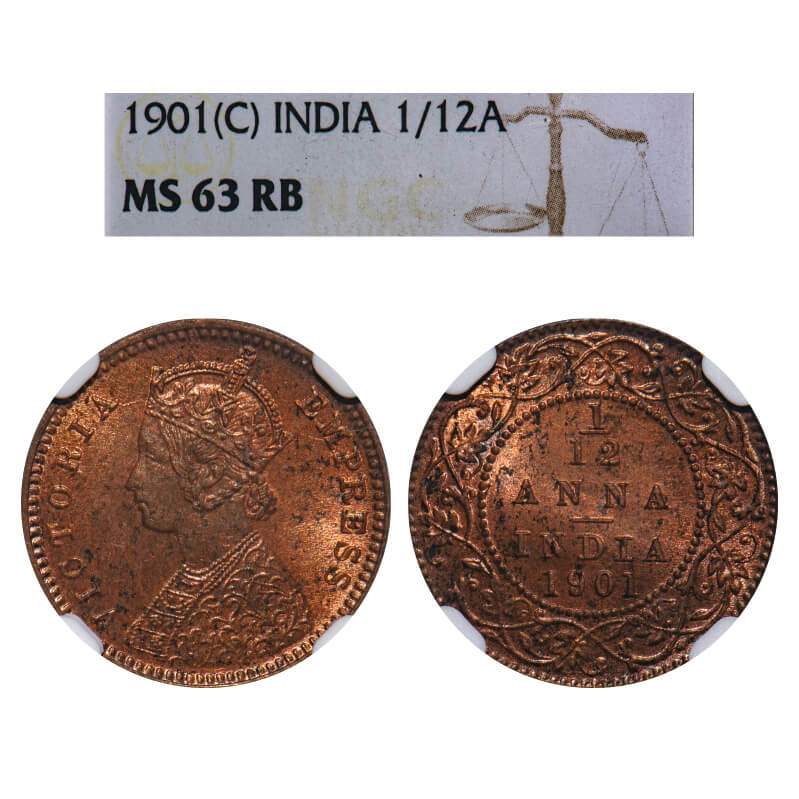 Victoria Empress, Copper, 1/12 Anna, 1901, Calcutta Mint, No mint mark, Obv B. F. Prid 805. GK 921. NGC Slabbed MS 63 RB. Very Rare.