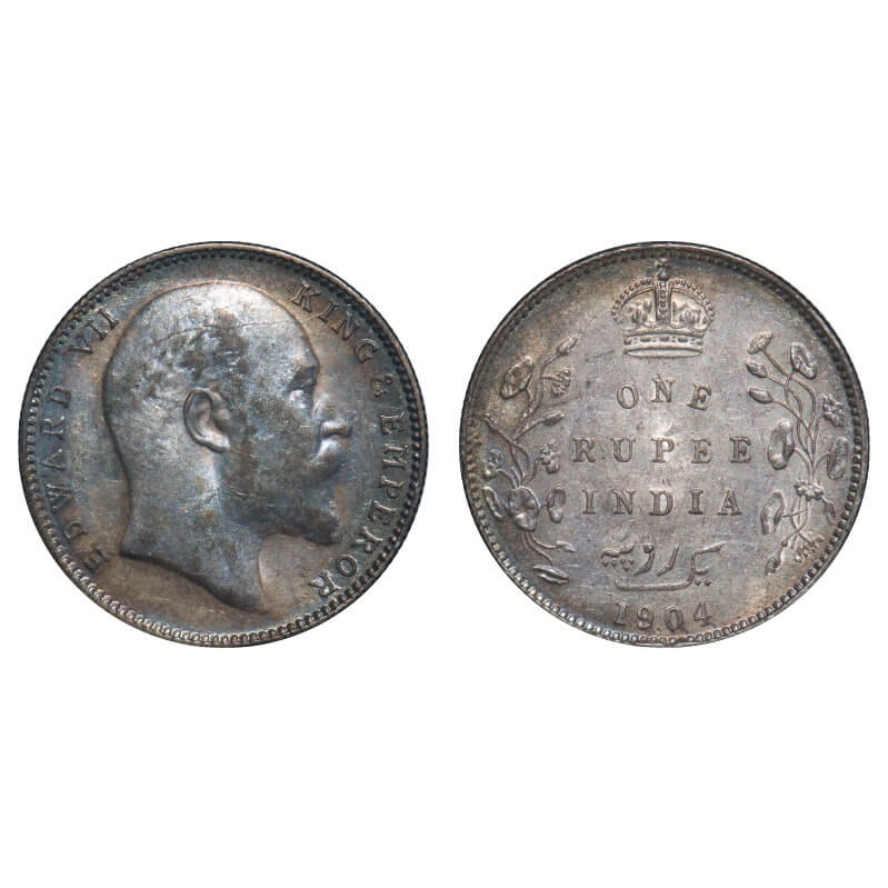 | Edward VII, Silver, Rupee, 1904, Bombay Mint, 'B' incused & dot, 5 Diamonds & bottom stroke of numeral 4 short, Thin horzontal & vertical lines on numeral 4, Ghost on Rev, Die crack on Obv. F. Prid 200. GK 932. Brillaint Uncirculated, Rainbow Tone Obv & Rev. Rare. |
