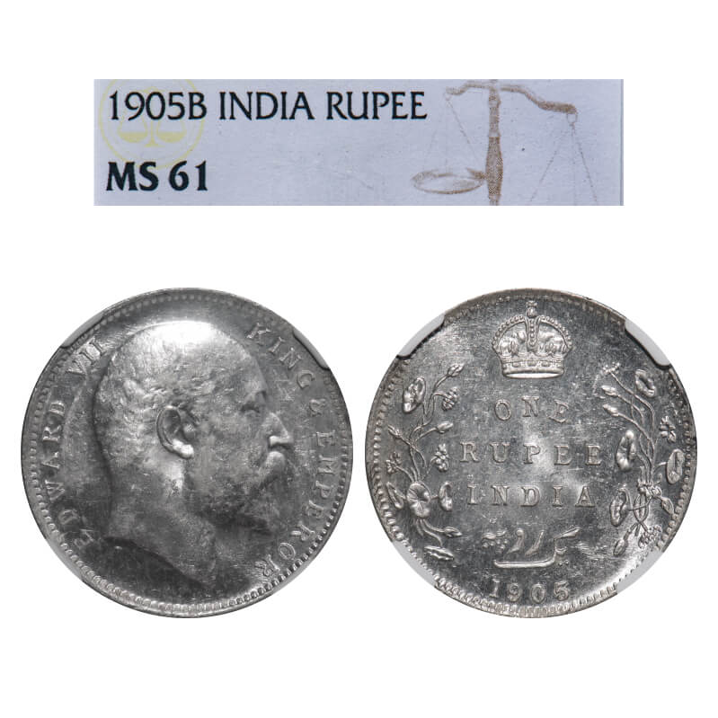 Edward VII, Silver, Rupee, 1905, Bombay Mint, 'B' incused & dot, Top stroke of numeral 5 long. F. Prid 201. GK 936. NGC Slabbed MS 61. Rare.