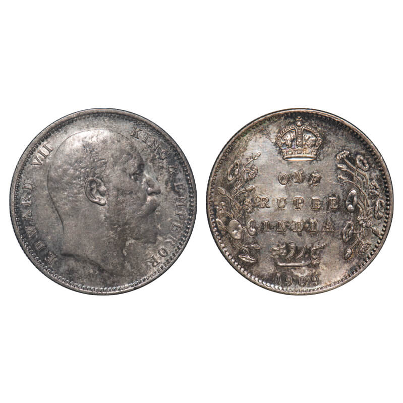 Edward VII, Silver, Rupee, 1909, Calcutta Mint, No mint mark. F. Prid 195. GK 950. Uncirculated, Toned. Rare.