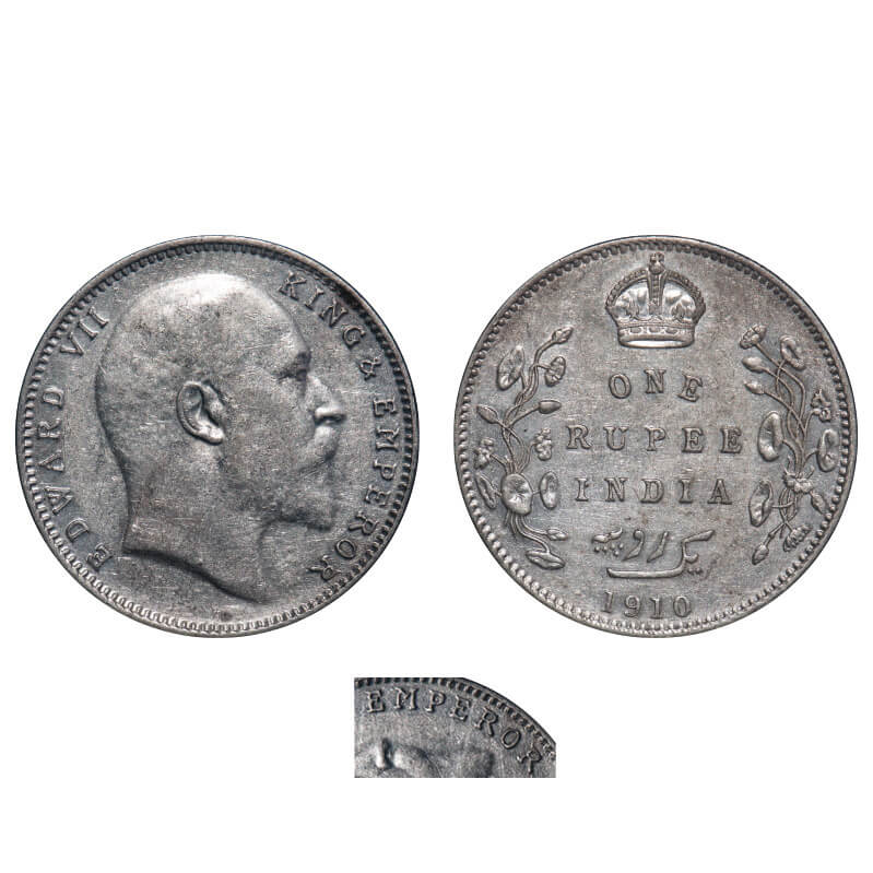 Edward VII, Silver, Rupee, 1910, Bombay Mint, 'B' incused and dot, Last numerals 10 struck on numeral 09, Legends of King and Emperor on Obv are in crudish style. F. Prid 206. GK 956. Extremely Fine+. Very Rare.